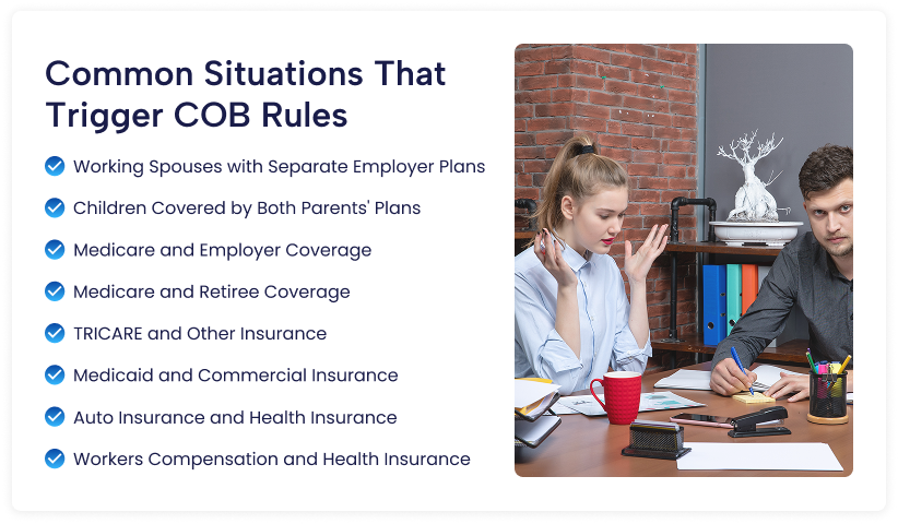 COB applies whenever a patient carries more than one health insurance policy. These are the most common scenarios.